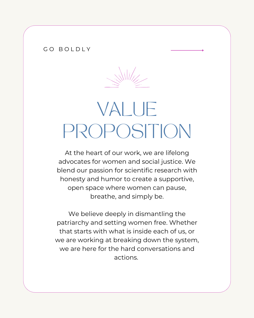 Scroll through to check out a deeper discussion of our Mission, Vision and Values. These are at the core of what we create, share, and challenge you all to experience in our content. Together we can change the conversation about and the reality of women’s lives.